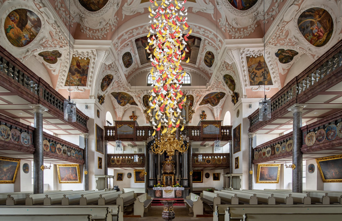 Die Flügel werden in der Ordenskirche in Bayreuth an fast unsichtbaren Fäden aufgehängt. So entsteht ein bewegender Raum voller Licht, Hoffnung und Gebet.